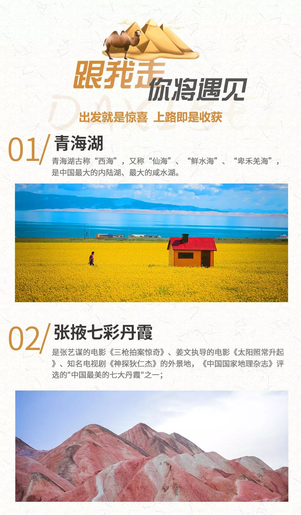 門票:莫高窟門票、張掖丹霞門票(含觀光車)、嘉峪關(guān)門票、鳴沙山門票、石油小鎮(zhèn)門票、茶卡鹽湖門票、青海湖二郎劍景區(qū)門票。(莫高窟普通門票構(gòu)成:門票180元/人+交通費(fèi)10元人+莫高窟數(shù)字展示中心48元/人;莫高窟應(yīng)急票構(gòu)成:門票90元/人+交通費(fèi)10元/人)