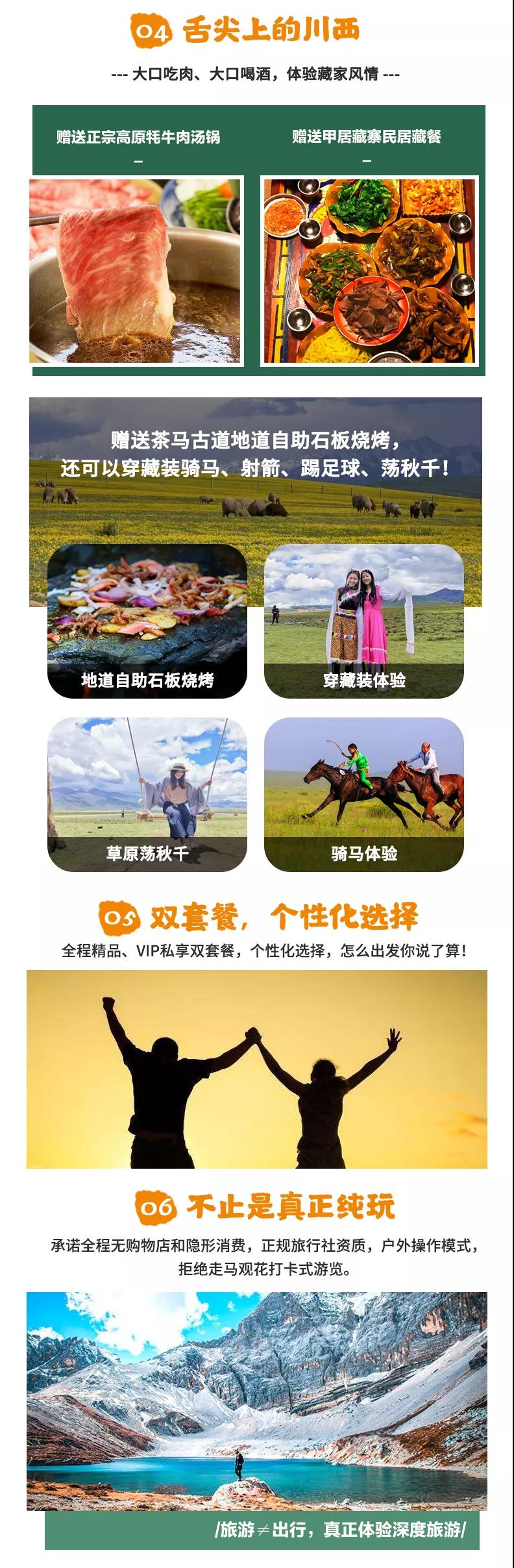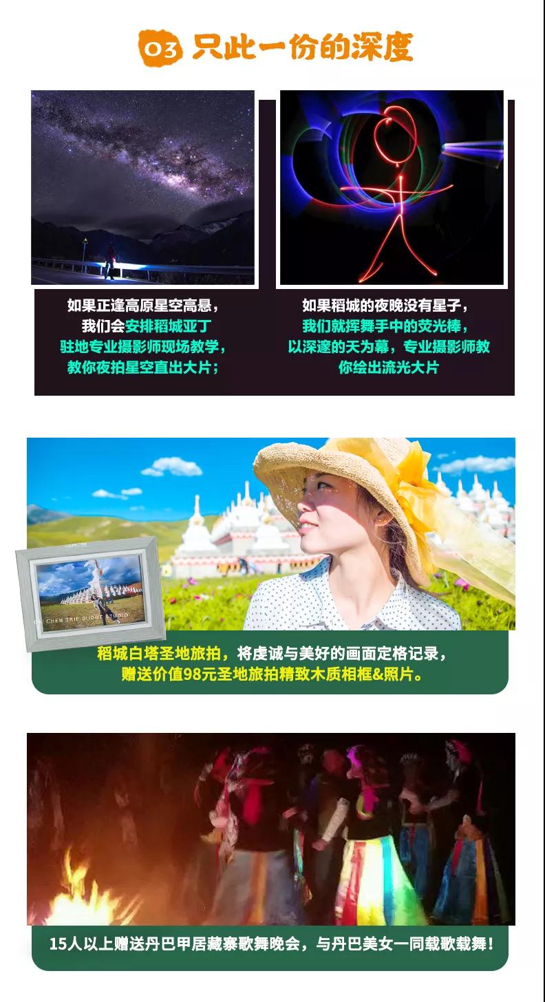 贈送:特色贈送甲居藏寨藏家晚餐、高原特色牦牛湯鍋、理塘茶馬古道自助石板燒烤;贈送旅游三寶、魔術頭巾、礦泉水緩解旅途疲勞;贈送價值98元圣地旅拍精致木質相框&照片;贈送稻城專業(yè)攝影師現場教學夜拍星空直出大片,沒有星星時則教拍流光大片;15人以上贈送甲居藏寨篝火晚會;贈送成都市區(qū)24小時接機/接火車服務;贈送項目不用不退。