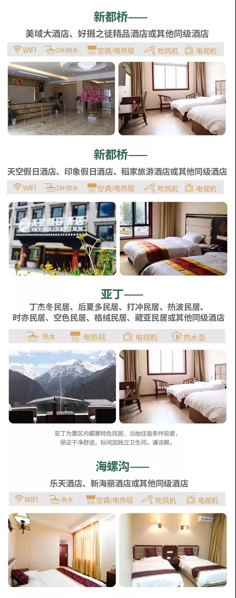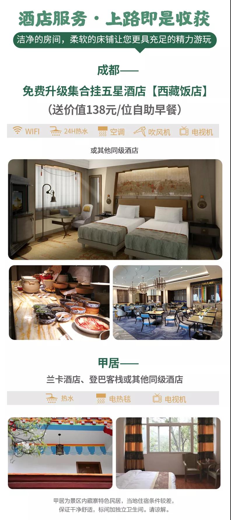 住宿:6晚當地精品酒店雙人標間+免費升級一晚成都集合掛五酒店雙人標間,確保酒店干凈衛(wèi)生,溫馨舒適。因沿途高原藏區(qū)條件有限,如果酒店設施沒有達到您的期望,敬請諒解。參考酒店如下: