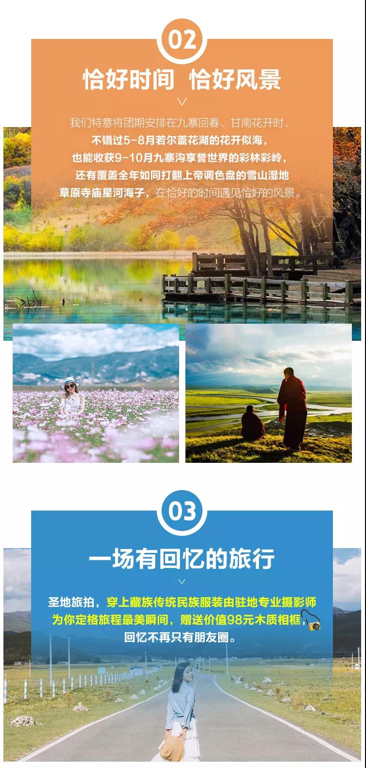 3、九寨溝面積較大游客需求不一,因此主要以游客自助游形式游覽,如無導游陪同望您諒解。游覽開始前導游會與您約定好集合時間,請務必按時到達指定地點,避免耽誤大家接下來的行程;
