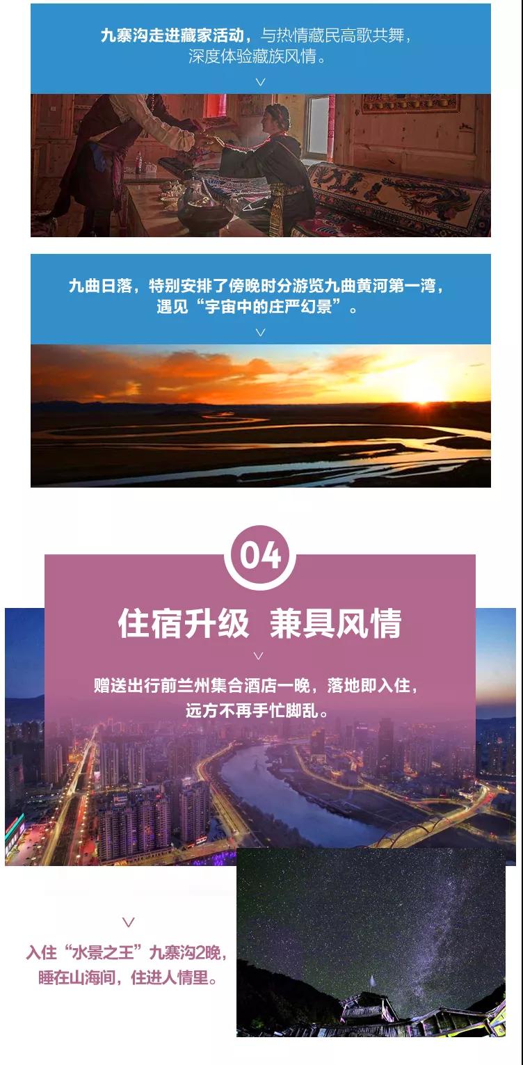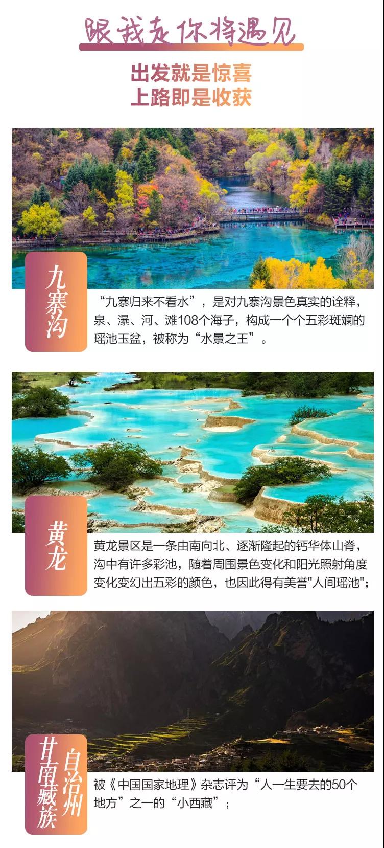4、九寨溝景區(qū)實行分區(qū)域開放,開放區(qū)域為溝口經諾日朗瀑布至長海,扎如溝的扎如寺及日則溝的鏡海;其中,長海、五彩池、鏡海、諾日朗瀑布、樹正群海、雙龍海瀑布、扎如寺等景觀原則上為步行游覽區(qū),具體游覽方式請聽從隨車講解員安排;