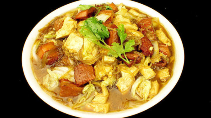 五臺山的特色菜,由本地產(chǎn)的土豆,粉條,豆腐、丸子和燒肉等燴制而成,也是當?shù)厝思壹覒魬舻囊坏兰页2恕?