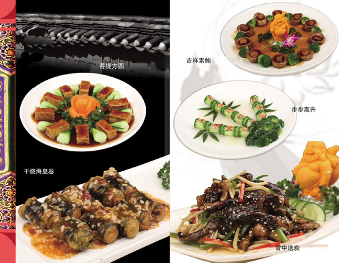 五臺山的素齋是用豆制品、面精、蔬果等為原料,通過精心的工藝制作和蒸、煮、炒、燒、燉烹調(diào)而成,如果您看著端上來的是條魚,吃起來也是條魚,但它卻是一道素齋。