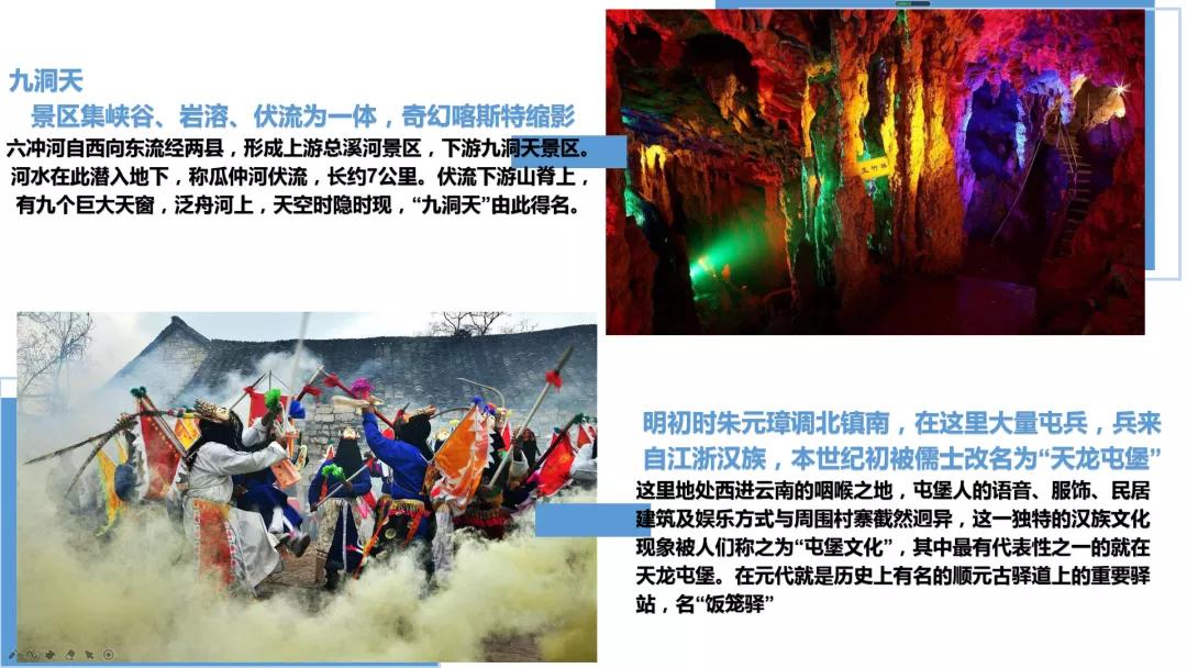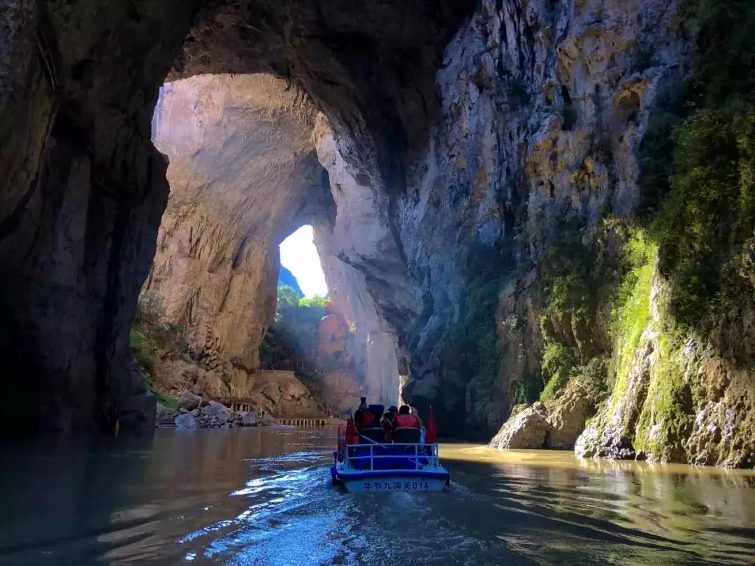 早餐后前往1989年與黃果樹瀑布一道被評為貴州省十大風景名勝區(qū)之一的九洞天。九洞天是國務院授予國家級重點風景名勝區(qū)之一,是烏江干流六仲河上游流經(jīng)兩縣之間的一段以伏流(當?shù)厝私嘘幒樱榇淼目λ固鼐C合地貌。該段伏流時隱時現(xiàn),神奇莫測,形成地下河,當?shù)厝朔Q瓜仲河,長約7公里,在下游長約6公里的河段上,箱形切割頂板多處塌陷,形成了大小不同,形狀各異的天窗洞口,使伏流明暗交替,洞洞相連,組合成集伏流、峽谷、洞穴、天橋、天坑、及生物化石為一體的雄奇瑰麗的巖溶大觀。