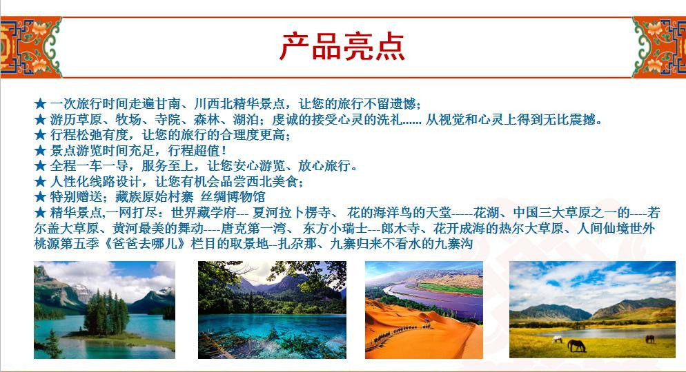B 線(xiàn)寧夏中衛(wèi)(沙坡頭、金沙島)/內(nèi)蒙阿拉善旗(通湖草原)/青海西寧(青海湖)/甘肅蘭州(臨夏東公館、拉卜楞寺、桑科草原、郎木寺、扎尕那石城、日拉米巴佛閣)四川阿壩藏族羌族自治州(九寨溝風(fēng)景區(qū)、藏式村寨、九曲黃河第一灣)空調(diào)專(zhuān)列12 日游