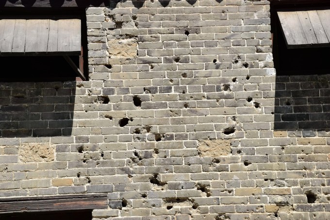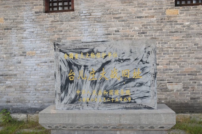 臺(tái)兒莊大戰(zhàn)遺址公園,位于臺(tái)兒莊古城較熱鬧地段,遺址公園內(nèi)保存有幾座臺(tái)兒莊大戰(zhàn)時(shí)的老宅,老宅墻壁上的累累彈孔默默訴說著當(dāng)年戰(zhàn)爭的殘酷性,也是講述臺(tái)兒莊大戰(zhàn)及緬懷中華民族一寸山河一寸血不屈的抗戰(zhàn)精神的圣地所在。臺(tái)兒莊大戰(zhàn)遺址公園也是各旅行團(tuán)游覽的第一站,因此,此地為臺(tái)兒莊古城景區(qū)內(nèi)人氣最旺的景點(diǎn)所在,我想這也是為了緬懷革命志士,宣傳臺(tái)兒莊不屈不撓的抗戰(zhàn)精神。