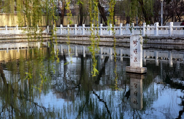 珍珠泉,坐落在院前街山東省人大常委會(huì)大院內(nèi)西側(cè),略成長(zhǎng)方形,面積1240余平方米,深廣清澈。因舊城東南隅護(hù)城河中有南珍珠泉,所以該泉又稱北珍珠泉。金《名泉碑》、明《七十二泉詩》、清《七十二泉記》均著錄。泉池溢水標(biāo)高26.28米。珍珠泉泉水由玉帶河北流進(jìn)濯纓湖,經(jīng)百花洲注入大明湖。珍珠泉自古以來頗負(fù)盛名,歷代多有文人題詠。