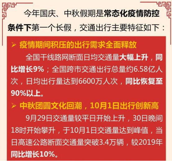 “2020年國慶節(jié)、中秋節(jié)八天,全國共接待國內(nèi)游客6.37億人次,按可比口徑同比恢復(fù)79.0%;實(shí)現(xiàn)國內(nèi)旅游收入4665.6億元,按可比口徑同比恢復(fù)69.9%?!?