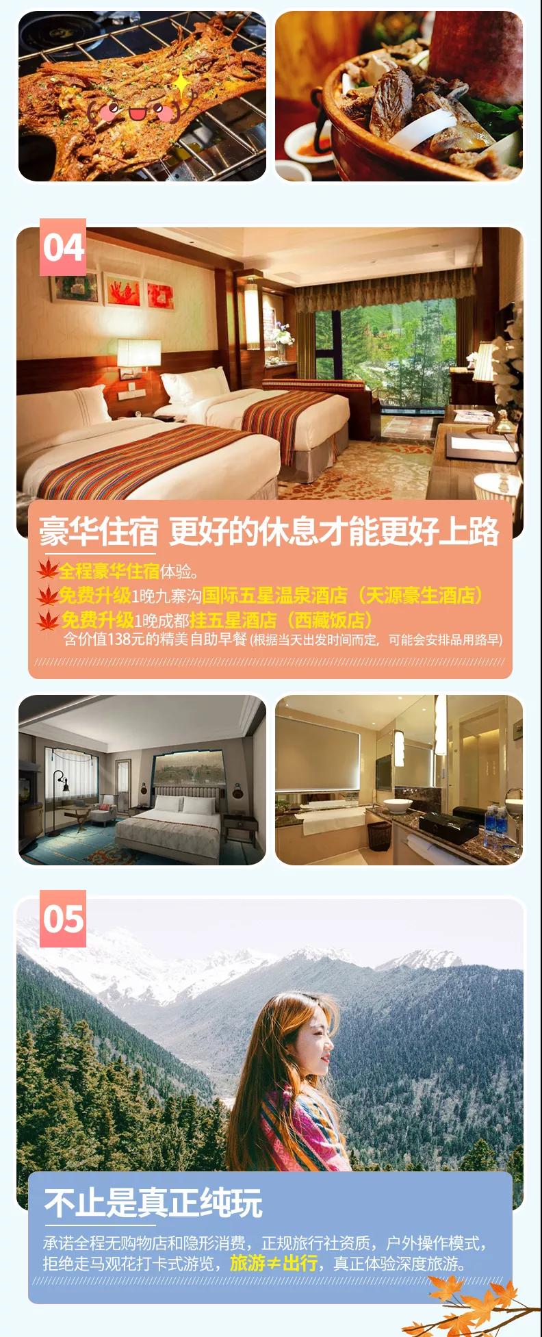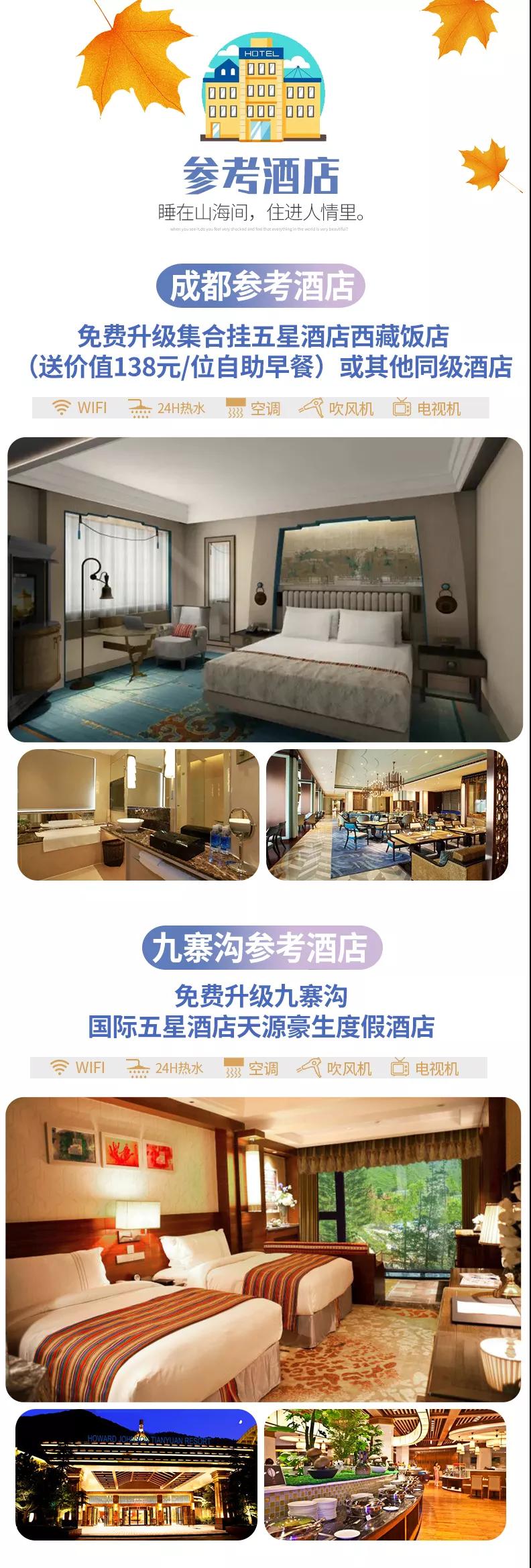 含全程4晚豪華酒店,免費(fèi)升級(jí)1晚成都掛五星酒店、九寨溝1晚國際五星酒店。參考酒店如下: