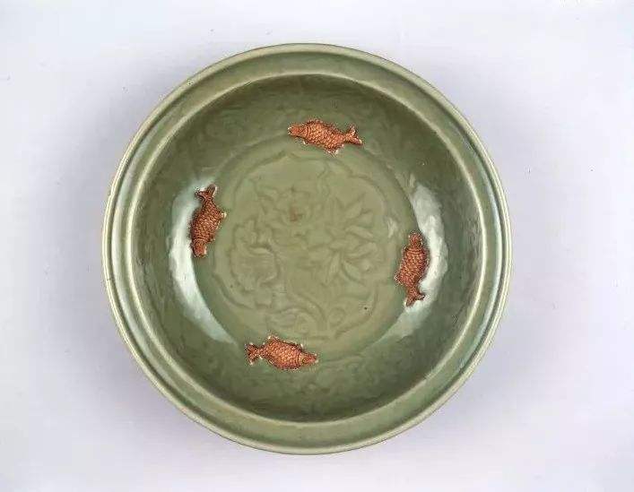 龍泉窯釉色蒼翠,北宋時(shí)多粉青色,南宋時(shí)呈蔥青色,沒有開片在器皿轉(zhuǎn)折處,往往露胎呈現(xiàn)胎色,瓷釉厚潤,裝飾上很少刻花、劃花,而流行用貼花、浮雕,例如在盤中常堆貼出雙魚圖案,在瓶身上貼出纏枝牡丹圖案。