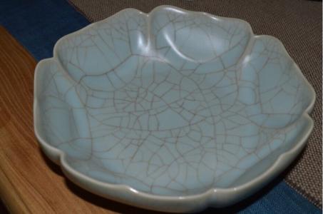 對(duì)汝瓷的開片有各種形容,如蟹爪紋,冰裂紋,蟬翼紋,魚子紋等,但我覺得用蟬翼紋來形容是恰如其分。而汝瓷釉中多布紅暈,有的如晨曰出海,有的似夕陽(yáng)晚霞,有的似雨過天青,有的如長(zhǎng)虹懸空,都是一些美麗的形象比喻,有點(diǎn)夸張。說到底就是釉面中泛起的紅斑塊顯露在青色的釉面上,好像魚子飄浮在水面上,僅此而已,我甚至覺得,這是汝瓷的缺陷。不過對(duì)汝瓷來說,又多了一個(gè)非典型特征。