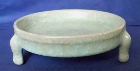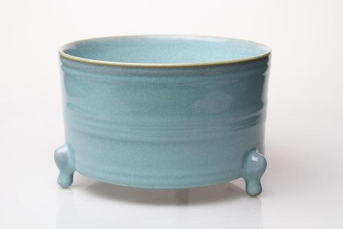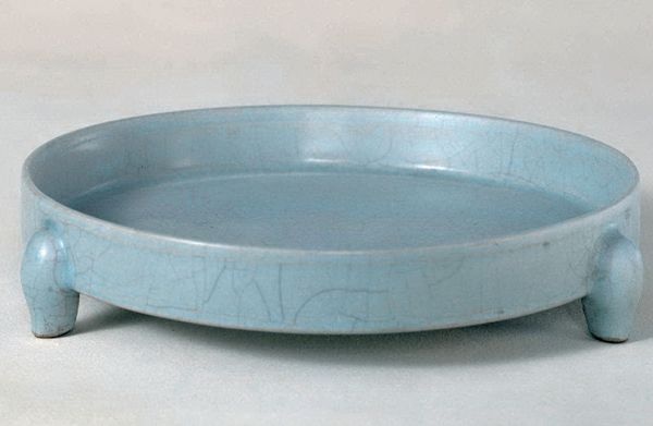 此器造型規(guī)整,釉呈淡天青色,柔和溫潤(rùn)。它應(yīng)與三足樽配套使用,用以承放三足樽。