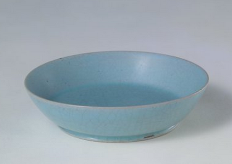 盤撇口,淺弧壁,坦底,圈足外撇。通體內(nèi)外施天青色釉,釉面開細(xì)碎片紋。因采用“裹足支燒”,因此外底留有3個(gè)細(xì)小支釘痕。