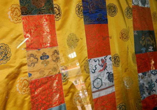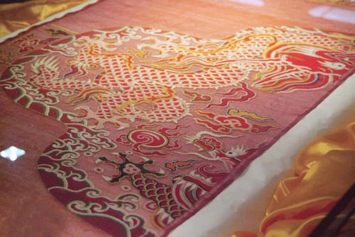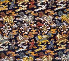 這是清代的宮廷織物,“寸蟒緞”屬妝花品種。妝花是南京云錦中最具特色的品種,它是在借鑒綜合不同時期、不同種類絲織工藝技術(shù)精華(妝花采用的挖花技術(shù),來源于戰(zhàn)國織成和唐宋緙絲;彩絨作為緯源自宋元的“絨錦”;大量用金繼承了元代織金錦的傳統(tǒng),大紋樣則是改革小花樓提花技術(shù)的成果)的基礎(chǔ)上形成的嶄新工藝,直到明代初年才正式出現(xiàn)。由于使用了獨特的“通經(jīng)斷緯、挖花盤織”(也就是根據(jù)實際需要在緯向同一梭道內(nèi)織上彩色的緯線)工藝。因此用色繁多、配色自由。妝花一直專供皇宮御用,因此它富麗輝煌的色彩與宮殿豪華的建筑裝飾風(fēng)格也是十分呼應(yīng)的。這種“逐花異色”的手工彩織技術(shù),直到今天還是不能用現(xiàn)代機器取代?!翱椊鸫珧y花緞”用金線和彩絨織出“小團龍”和“骨朵云”?!按珧?,也被稱為“金錢蟒”,由于團龍花紋直徑很小而得名。又因為整個“骨朵云”紋樣外緣輪廓很象“魚”形,因而人們也叫它“魚妝”。