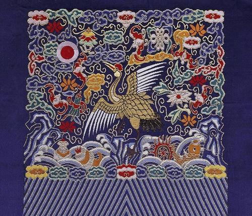 云錦是專為帝王將相、王妃公主們做服飾的,有著鮮明的宮廷文化的烙印。君權(quán)神授是封建君主專制制度的一種政治理論。歷代帝王自命“真龍?zhí)熳印?,受命于天,統(tǒng)治眾生。故而,皇帝的衣服藻飾華麗,服飾上大量使用神獸“龍”的形象。北京故宮博物院收藏的雍正皇帝云錦朝服,在石青色素緞地上,于前胸、后背、肩部織團花五爪正龍、腰圍行龍五,襞積前后團龍各九,裳正龍二,行龍四;披領(lǐng)行龍二,袖端正龍各一;通身五彩祥云,下八寶平水,海水江崖。龍袍上除表現(xiàn)惟我獨尊的天子尊位外,還隱喻著“一統(tǒng)山河”和“萬事升平”的寓意。文武官員的服飾則有著森嚴的等級差別,明代文武一般官服,按官品等級不同,顏色花紋各有區(qū)別。大官紅袍,中等青、綠袍,小官檀和褐綠袍?;ǘ湟卜执笮?,小官無花紋。更明顯的區(qū)別標(biāo)志是補子,文禽武獸,胸背各一。