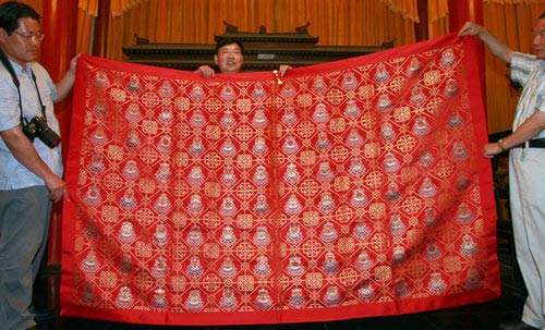 織金又名“庫金”,也是因織成以后輸入宮廷的“緞匹庫”而得名。“織金”就是織料上的花紋全部用金線織出。也有花紋全部用銀線織的,叫做“庫銀”。庫金、庫銀屬同一個品種,分類上統(tǒng)名之為“織金”。明、清兩代江寧官辦織造局生產(chǎn)的織金,金、銀線都是用真金真銀制成,在每匹織料的尾部,均織有“×××××織造真金庫金”字牌。說明所用的金、銀線材料貨真價實。從明、清兩代傳世的織金錦緞看,由于金線材料考究,雖經(jīng)過數(shù)百年的時間,至今仍是金光燦爛,光彩奪目。
