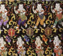 童子攀枝妝花清代用料。主體紋樣源自清代宮廷,后由朝廷賞賜給西藏達賴喇嘛,成為達賴喇嘛寶座上方的頂蓬裝飾,受人頂禮膜拜。童子手持蓮花,作攀登狀,寓意“年年”好合(“蓮”的諧音)、飛升騰達、五子登科。同時,“蓮”又諧音“憐”,古語中可憐即可愛之意。童子形象生動可愛,表情細膩傳神,紋樣色彩豐富高雅、線條柔婉飄逸,是云錦藝術(shù)中的珍品之一。