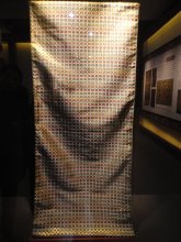 龍袍上17條龍使用了真金線和包裹了孔雀羽的絲線原料。真金線首先要把金塊制成金箔。兩人相對而坐,輪流舉錘,經(jīng)過3萬多下的錘打,把一塊厚重的黃金,變成輕如鴻毛的金箔,再把金箔粘在一種特殊紙張上,壓緊拋光,最后裁成條,剝出金線,和蠶絲相互纏繞,捻搓成金絲線。這件“孔雀羽織金妝花紗龍袍”復(fù)制品于1985年送展日本筑波科技世博會。
