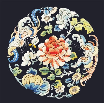 以上是團花紋樣在花紋組合上常用的幾種方法。團花紋樣的構(gòu)成,在實際應(yīng)用中并不止這幾種方法。如傳統(tǒng)紋樣中的“五福捧壽”團花,是用五只同形的蝙蝠,作向心的等份組合,中心安放以圓形的篆體“壽”字,組成一個完整的團紋?!鞍讼蓱c壽”團花,是用八件形狀各異的寶物,在圓形中作適合形的組合,中心安以篆體“壽”字組成?!笆率氯缫狻眻F花,是用一柄如意和兩只柿子,在圓光中作適合形的安排處理即成。此外,還有用一枝折枝花,或一只花籃作圓形的適合處理,外邊再加一圈規(guī)律性構(gòu)成的花邊,組成一個完整的團紋。還有用八組同形同量的花紋,作向心的或放射狀的組合,也可組成一個完整的團紋。