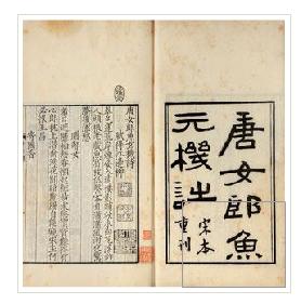 北圖所存宋本《唐女郎魚玄機(jī)詩》,乃宋陳起陳解元書籍鋪所刻,卷尾鐫有“臨安府棚北睦親坊南陳宅書籍鋪印”。此本,明代曾先后為朱承爵、項元汴等藏書家收藏。至1803年(清嘉慶八年),又為大藏書家黃丕烈所得。1916年(民國五年),又落入袁克文之手。其后散出,為北圖收藏,終成國家藏書。