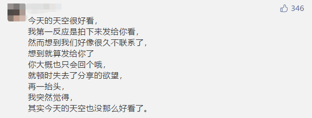 可他看到消息,選擇了視而不見(jiàn)。在你仍舊等待,翹首以盼會(huì)收到回復(fù)時(shí)。他早就把你當(dāng)作無(wú)關(guān)緊要的事,拋到九霄云后。等到突然想起來(lái)的時(shí)候,就回一個(gè)“嗯”??赡銋s發(fā)現(xiàn)他的狀態(tài)欄,更換了好幾次。一起聚餐喝酒,別人都帶上愛(ài)人,唯獨(dú)他不帶你。