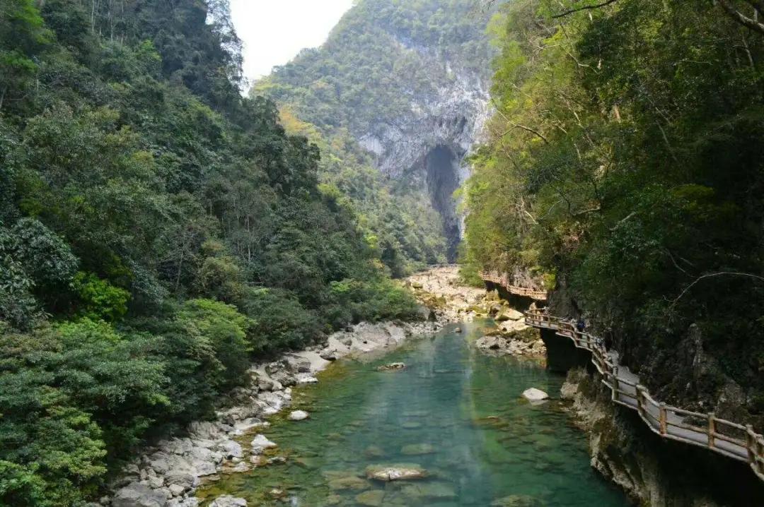 下午:后乘車(chē)前往游覽國(guó)家AAAAA級(jí)景區(qū)【大七孔】(游玩時(shí)間不少于2小時(shí));大七孔是以原始森林、峽谷、伏流、地下湖為主體的景區(qū),沿著恐怖峽打狗河直下,可見(jiàn)吊橋,右邊的棧道一面靠山,一邊臨水,蜿蜒曲折,凹凸不平。最為震撼的還是走過(guò)棧道的三分之二處,有一橫跨河兩岸的天然巨巖,是喀斯特是貌奇觀之一,俗稱(chēng)天生橋,被專(zhuān)家們譽(yù)為“大自然神力所塑的東方凱旋門(mén)”,仰觀橋孔下,只見(jiàn)巨型鐘乳懸掛,橋腳、橋側(cè)的裂隙石縫長(zhǎng)出綠石草叢灌木,藤蘿花卉纏裹橋身,真是滿(mǎn)目琳瑯、五顏六色的天然大彩橋。
