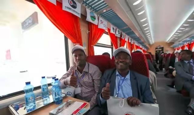 乘坐亞吉鐵路首發(fā)列車的非洲兄弟為中國(guó)點(diǎn)贊