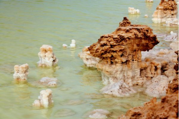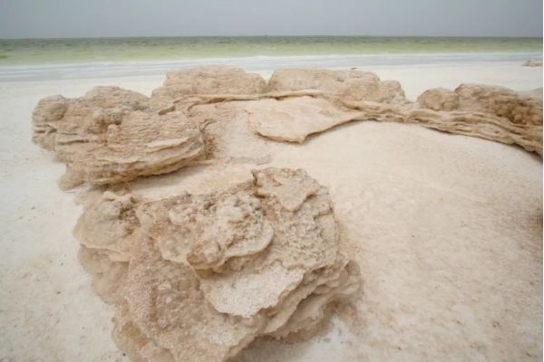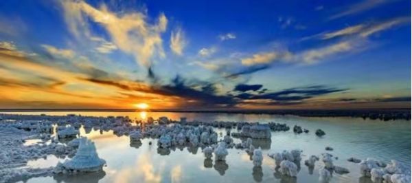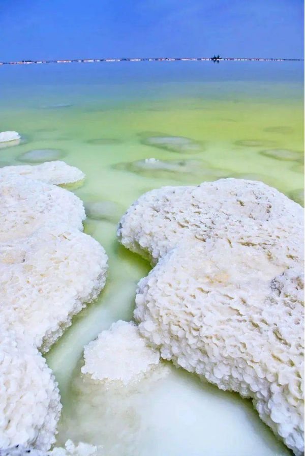 因為氣候炎熱干燥,湖水的蒸發(fā)量遠遠高于降水量,湖內(nèi)便形成了高濃度的鹵水,然后逐漸結(jié)晶成了鹽粒。而鹽花是鹽湖中的鹽結(jié)晶形成的特殊形狀的結(jié)晶體,由于結(jié)晶時的溫度,氣候,時間長短,濃度不同等原因,形成了各式各樣,萬千變化的美麗鹽花。生命的禁區(qū),萬物俱寂,但是唯有“鹽花”開的最旺,它就是大自然賜給人類的絕妙作品,日夜看守這片凈土。這些鹽花無需人工的雕琢,形態(tài)各異,有的宛如貝殼,有的宛如樓臺,一叢叢,一片片,一簇簇地立于鹽湖中,把鹽湖裝飾得如仙境一般。