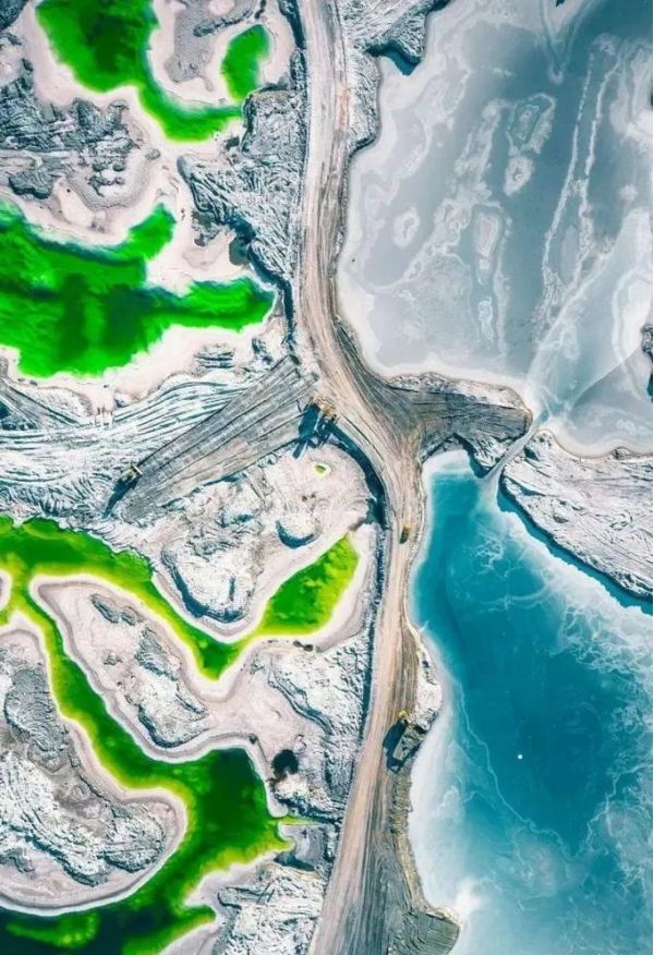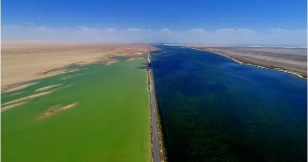 東、西臺(tái)吉乃爾湖,在一條狹長(zhǎng)的棕黃色鹽堿土路兩側(cè),呈現(xiàn)出一邊碧綠,一邊青翠,截然相反的絕美水色。