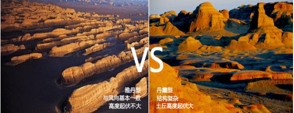 這里我先給大家po上兩個名詞解釋。雅丹—維吾爾語譯名,指風(fēng)力吹蝕未固結(jié)、較松散的河流和湖泊沉積物而形成的一些“陡峭的土丘”,在干旱區(qū)分布廣泛;丹霞—是經(jīng)由地殼抬升后,由流水、風(fēng)化和重力等作用塑造而成,“頂平、身陡、麓緩”,巖性堅硬,年代遠(yuǎn)比雅丹古老。