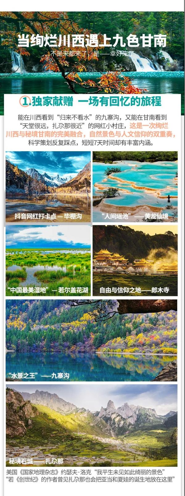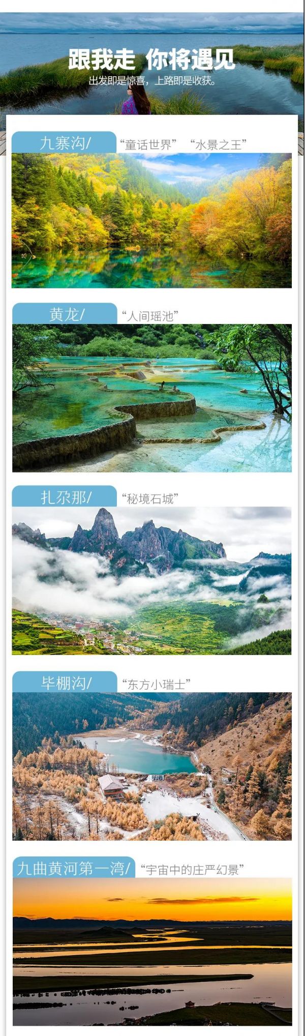 4、九寨溝景區(qū)實(shí)行分區(qū)域開(kāi)放,開(kāi)放區(qū)域?yàn)闇峡诮?jīng)諾日朗瀑布至長(zhǎng)海,扎如溝的扎如寺及日則溝的鏡海;其中,長(zhǎng)海、五彩池、鏡海、諾日朗瀑布、樹(shù)正群海、雙龍海瀑布、扎如寺等景觀原則上為步行游覽區(qū),具體游覽方式請(qǐng)聽(tīng)從隨車講解員安排;