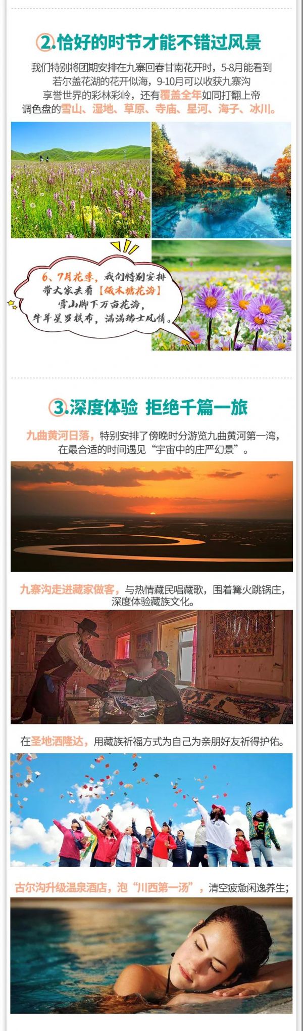 3、九寨溝面積較大游客需求不一,因此主要以游客自助游形式游覽,如無(wú)領(lǐng)隊(duì)陪同望您諒解。游覽開(kāi)始前領(lǐng)隊(duì)會(huì)與您約定好集合時(shí)間,請(qǐng)務(wù)必按時(shí)到達(dá)指定地點(diǎn),避免耽誤大家接下來(lái)的行程;