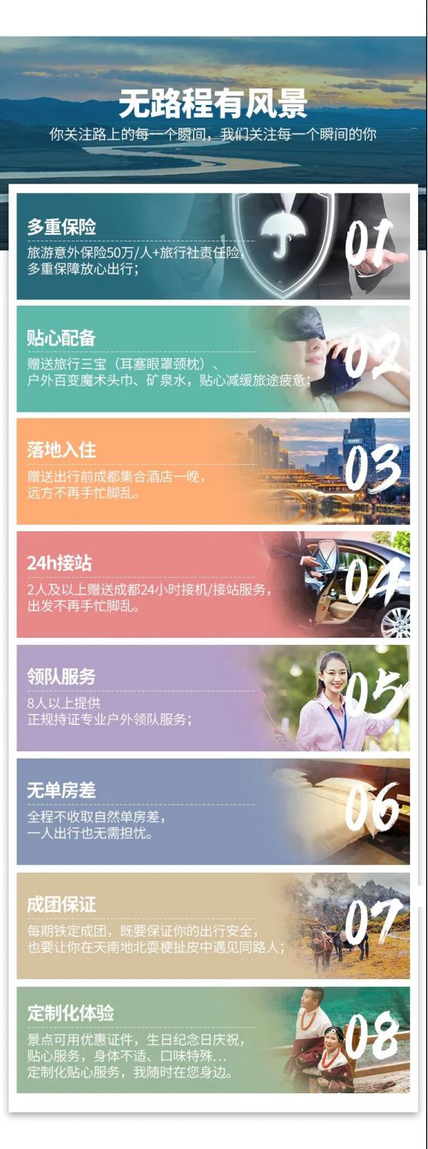 6、領(lǐng)隊(duì)服務(wù):8人以上提供正規(guī)持證專業(yè)領(lǐng)隊(duì)服務(wù);8人及以下由經(jīng)驗(yàn)豐富的司機(jī)提供向?qū)Х?wù)。