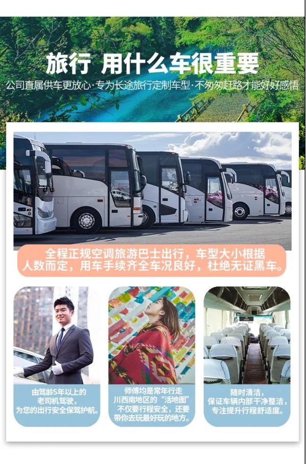 1、關(guān)于車輛交通:目前四川旅游市場(chǎng)8座以下車輛無(wú)法辦理旅游牌照,請(qǐng)游客知悉,以此理由提起的投訴我方拒不受理,望您諒解。