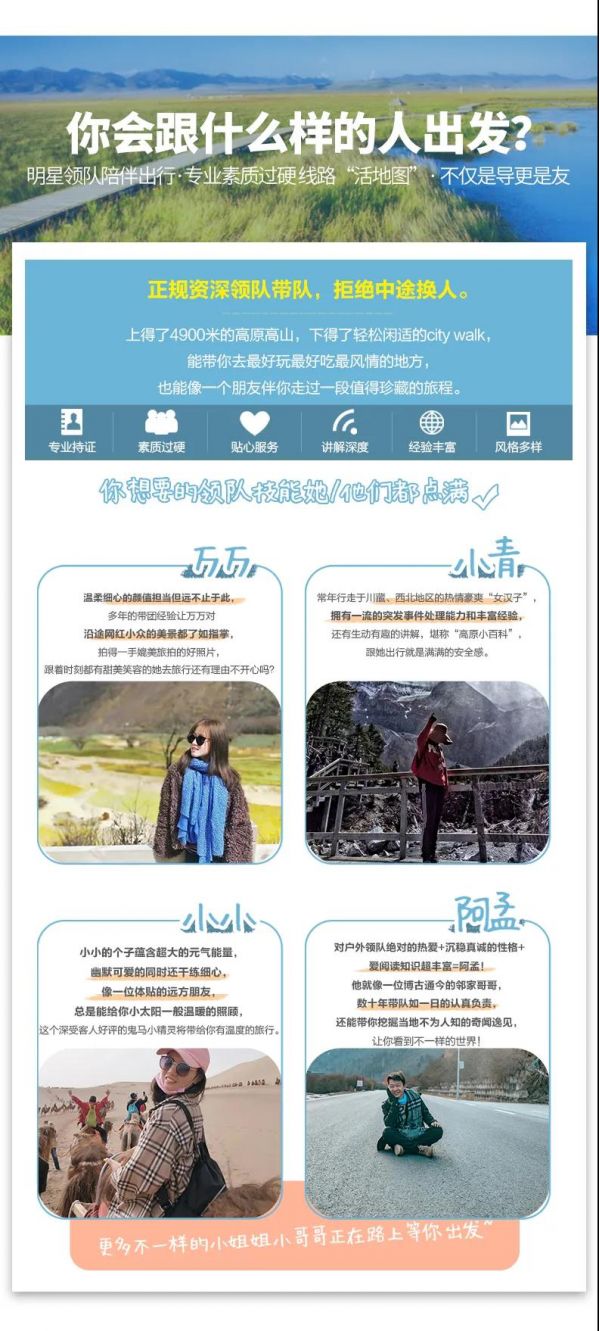 ? 私人訂制:我們客戶范圍囊括了全國(guó)各大城市,川西、西北、東北,皖南,貴州,在路上永遠(yuǎn)有我們的身影。我們將為每一個(gè)有定制需求的你策劃出獨(dú)屬于自己的完美旅行。