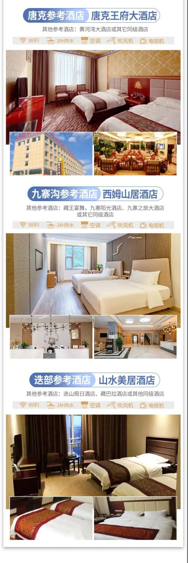 3、住宿:6晚當(dāng)?shù)鼐肪频?,確保酒店干凈衛(wèi)生,溫馨舒適。因沿途高原藏區(qū)條件有限,如果酒店設(shè)施沒(méi)有達(dá)到您的期望,敬請(qǐng)諒解。參考酒店如下: