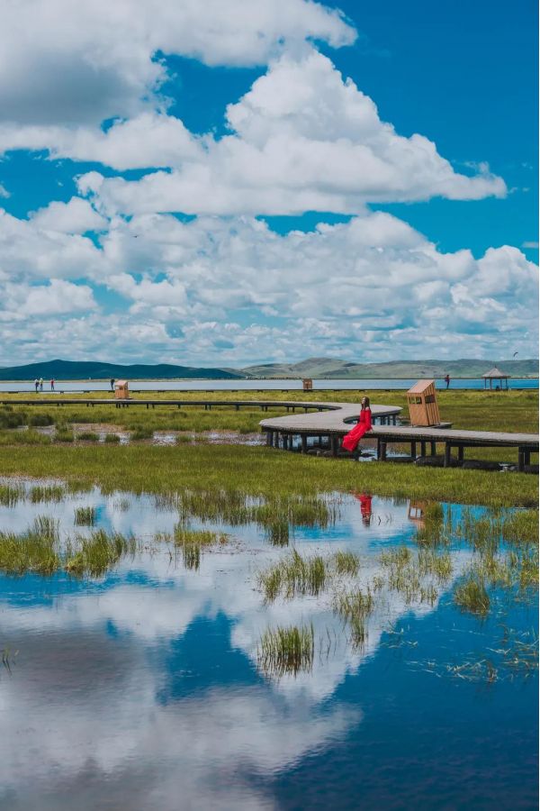 然后我們前往草原湖泊【若爾蓋花湖】,花湖湖面遼闊,水下是深不可測(cè)的沼澤地,在陽(yáng)光的照耀下,水面反射出不同的光彩,攝人心魄。湖邊是大片茂密的蘆葦叢,隨微風(fēng)拂動(dòng),越發(fā)映襯出湖面的寧?kù)o與滄桑?;ê钇恋臅r(shí)候是每年夏天,草地上開(kāi)滿了五顏六色的花朵,極為漂亮。廣闊的草原一片碧綠,藍(lán)色的花湖被一片綠色包圍,仿佛綠色地毯上的一顆藍(lán)寶石,美輪美奐。湖邊建有木質(zhì)棧道,一直延伸到水中,可以沿著棧道走到濕地深處,沿途都可以找到拍大片的好角度?;ê潜姸嘁吧w禽的主要棲息地,湖面上游弋著黃鴨、斑頭雁、天鵝、黑頸鶴等珍稀動(dòng)物,還有高原魚類和其他珍稀動(dòng)物。坐在湖邊或者棧道上的亭子里,常有黑頸鶴從湖面上掠過(guò)。