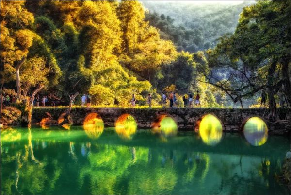 早餐后前往國家AAAAA級風(fēng)景區(qū)【小七孔】(游玩時間約4小時);景點之間需換乘電瓶車(電瓶車40元/人,景區(qū)保險10元/人,費用自理)小七孔景區(qū)因一座建造于道光十五年間(1836年)的【小七孔石橋】而得名;景區(qū)被稱之為“超級盆景”,集山、水、洞、林、湖、瀑布等為一體,在長不到2公里的峽谷內(nèi),起迭著68級瀑布,順贄而下,奔瀉而去【68級跌水瀑布】。【拉雅瀑布】精巧醉人,水珠飛濺;而長不到600米之水上森林,樹根盤在錯石上,清澈的水流沖刷著青石,行走于其中,若身臨瓊瑤仙池。拱壩截水而形成的【臥龍?zhí)?/strong>】水從壩頂傾瀉下來,如一道銀色的水簾掛在眼前,壯觀而又秀美,水面經(jīng)過吸收、反射和折射,呈現(xiàn)各種藍色,真是美如仙境。