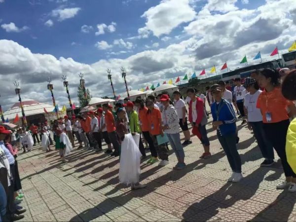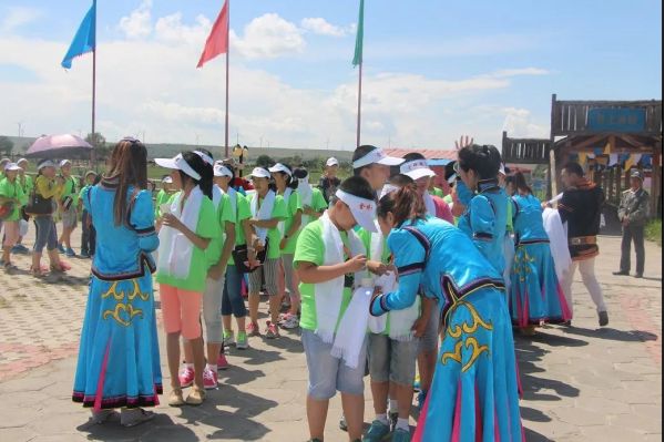下午:來到了美麗的安固里草原,蒙古族小伙和姑娘們載歌載舞,為營員獻上潔白哈達,遞上蒙古歡迎禮節(jié) “下馬酒”。
