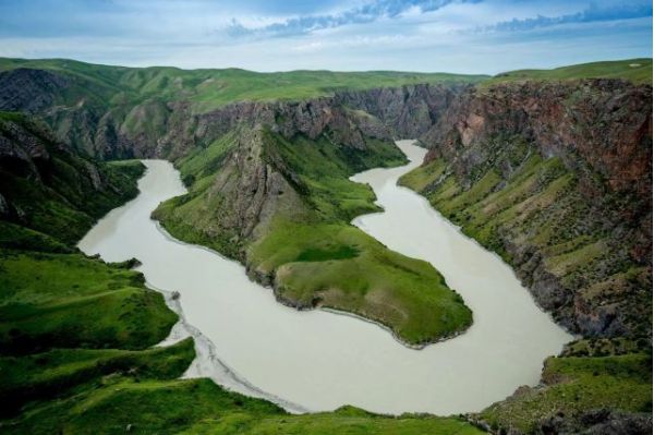 闊克蘇大峽谷之中美麗的闊克蘇河蜿蜒曲折,崖岸陡峭,地勢(shì)險(xiǎn)峻,形成了壺口瀑布、九曲十八彎、鱷魚灣等自然景觀。這里群山環(huán)繞,山巒重疊,谷間河水平緩,波光蕩漾,河灣植被郁郁蔥蔥,炊煙和著林間輕霧,牧民的氈房若隱若現(xiàn)點(diǎn)綴其間,一派壯美而又不失旖旎的峽谷草甸風(fēng)光。