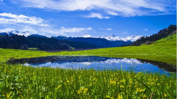 唐布拉草原得名于阿吾拉勒山北坡唐布拉溝東側(cè)有幾處突兀的巖石,因巖石酷似玉璽、印章而得名。唐布拉草原意即"印章"。唐布拉草原景點(diǎn)眾多,據(jù)說(shuō)有113條溝,每條溝都有各自的特色。流泉瀑、溪水淙淙;奇特的阿爾斯郎石林,壯觀的草原落日;冰峰雪嶺倒映在靜寂幽深的高山湖泊之中。溫?zé)崆逅臏厝{(lán)藍(lán)的天,綠茵茵的草坂,每時(shí)每刻給人以美的享受。