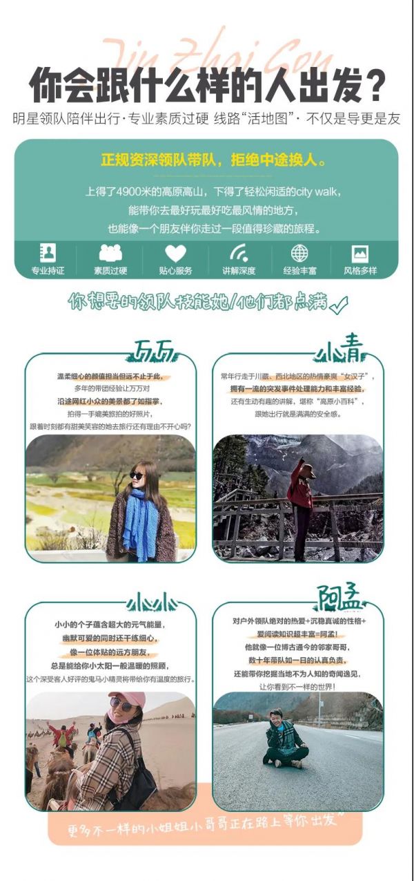 8人以上提供正規(guī)持證專業(yè)戶外領(lǐng)隊(duì)服務(wù);8人及以下,由經(jīng)驗(yàn)豐富的司機(jī)提供向?qū)Х?wù),無(wú)單獨(dú)領(lǐng)隊(duì)服務(wù)。