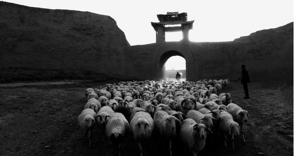 5、景泰古城的落日城樓,牧羊歸來的場景,光影在城樓斜陽里,牧群歸來,塵世喧囂的生活。