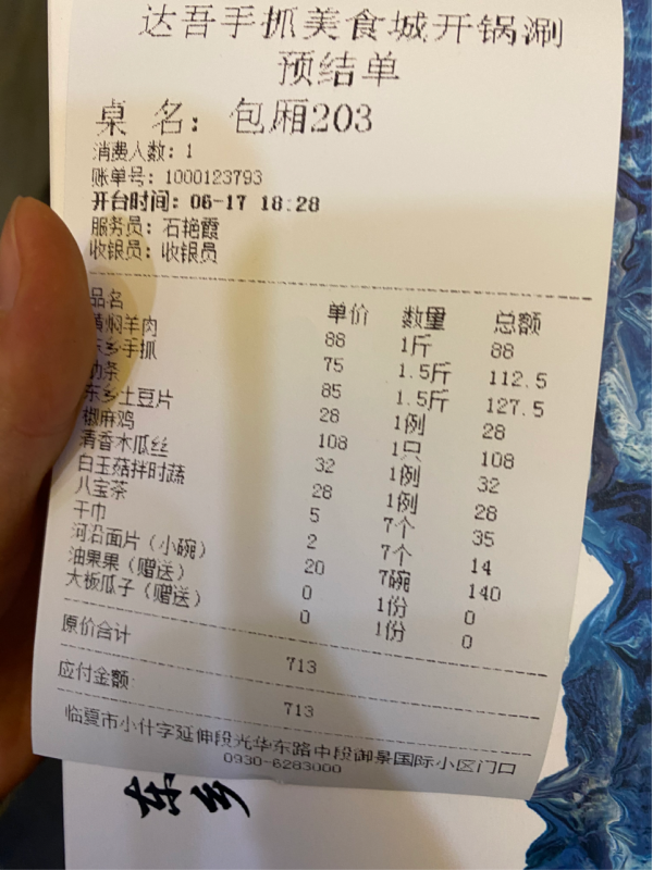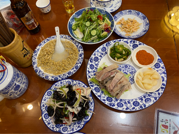 游覽結(jié)束,回到天水市區(qū)入住。想吃當(dāng)?shù)靥厣?,找到了“老家八大碗”解決晚飯,非常滿意,手抓羊肉、甜胚子、大拌菜,有滋有味。此時(shí)還不知道接下來(lái)面臨什么樣的美食荒漠。當(dāng)?shù)氐臋烟乙脖容^有名便宜,路上買了一點(diǎn)。