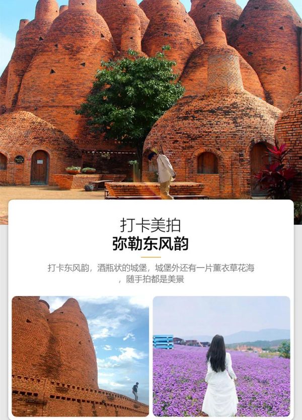 后前往彌勒,游覽【東風(fēng)韻】(含電瓶車),被稱為東方波爾多,萬畝碧綠的葡萄園,夢幻無際的紫色薰衣草,醉了每一個走進(jìn)東風(fēng)韻的人,順著中國最大的的紅磚建筑群萬花筒藝術(shù)莊園,一路走來,藝術(shù)的熏陶和美麗的風(fēng)景融為一體,讓您感受難得的東風(fēng)韻。游覽結(jié)束后入住石林溫泉酒店,體驗溫泉給身心的放松。