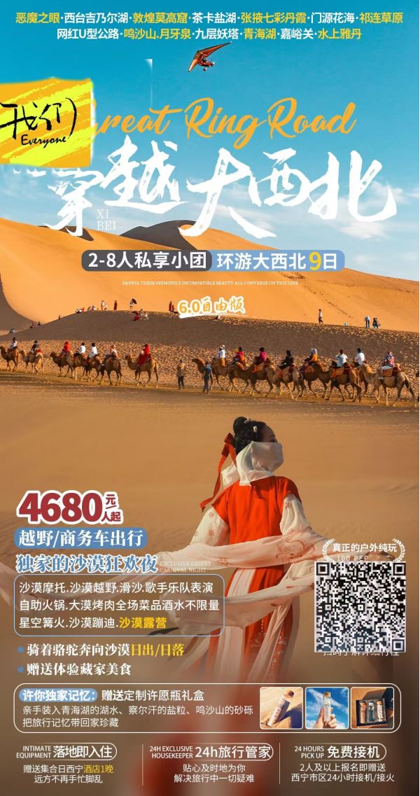 如果讓我們推薦一條去- -次抵十次的旅行路線,那一定是西北大環(huán)線!沙漠、戈壁、雪山、草原、花海、湖泊、石窟、雅丹、丹霞...這些看似無法兼容的美景,全部都真實匯聚在這條線路.上!,我們深耕大西北多年,不斷打磨迭代升級推出西北大環(huán)線6.0版本,保留最經(jīng)典的風(fēng)景,解鎖小眾高顏值景點給你最難忘的大西北旅行。
