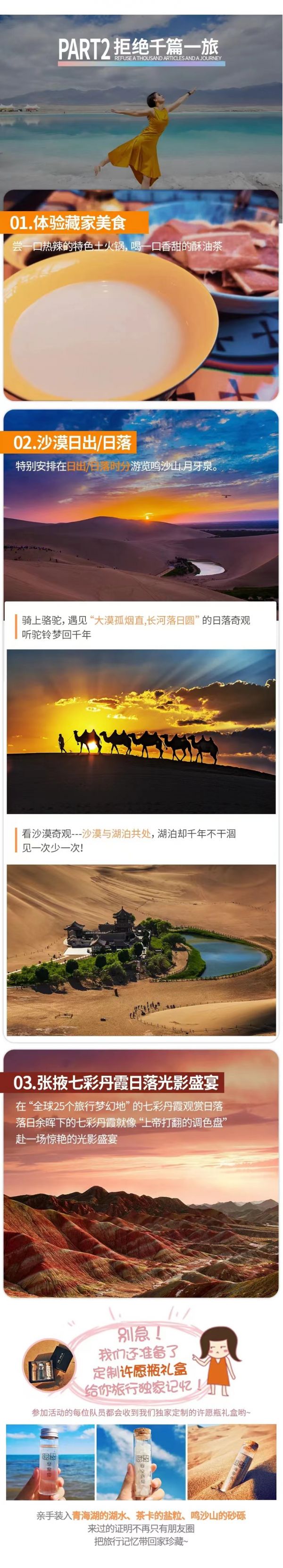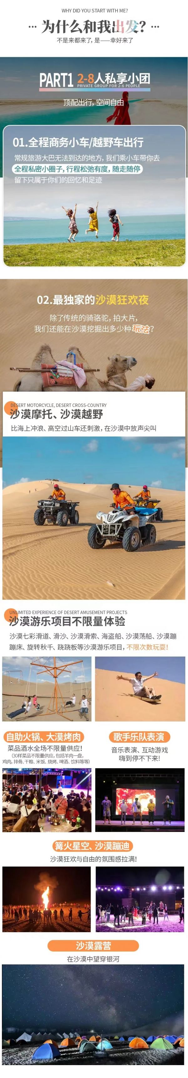 從石油小鎮(zhèn)出來隨后直達(dá)【敦煌】如時間充??蓞⒂^敦煌古城 ,最后我們抵達(dá)千年古城敦煌,有人說過,這里的風(fēng)都有歷史的氣息。今晚我們特地安排了沙漠露營!沙漠露營為贈送項目,可根據(jù)自己身體狀況自行選擇。包括沙漠摩托、滑沙、土火鍋、啤酒烤肉、沙漠演唱會、煙花表演、篝火晚會、鍋莊舞,之后分發(fā)帳篷睡袋在大漠星空下露營,銀河系清晰可見任何時節(jié)只要天空晴朗都可看見流星。