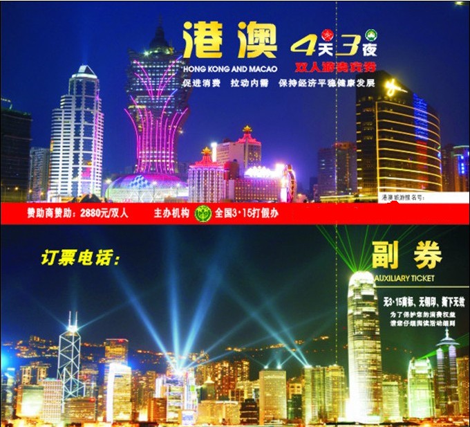 歲末年關正是商家的打折促銷季,某家電品牌推出了買家電贈送價值3980元的港澳4天3夜雙人游貴賓券活動。此券由名為“中國深圳國際旅游集團”主辦,持券人僅需交納港、澳導游、司機小費及港澳口岸服務費、離境稅等220元,而在港澳期間的交通、住宿、餐飲、景點門票及保險費用全費。張先生夫婦覺得很劃算,拿到旅游券后就報了名,按照要求時間在深圳集合。同團有近30名游客,手中的券有買保險贈的,有買手機贈的,有做美容贈的,都不是在旅行社花錢參的團。張先生覺得有些不對勁,這時老伴指著旅游券說:“你看,上面都寫了本次活動絕無強制性消費、欺騙游客行為,肯定沒事!”結果,接下來的幾天行程簡直是噩夢一般的遭遇:導游天天帶大家到珠寶店、手表店購物;商品質次價高,同團游客不愿購買,東躲西藏地躲導游,導游就威脅辱罵;張先生夫婦已經買了5000元的商品,導游還不滿意,聲稱不買到他滿意的金額就用集裝箱將游客拉到澳門去。行程結束后,張先生向旅游部門投訴。經核實,所謂“中國深圳國際旅游集團”純系子虛烏有。