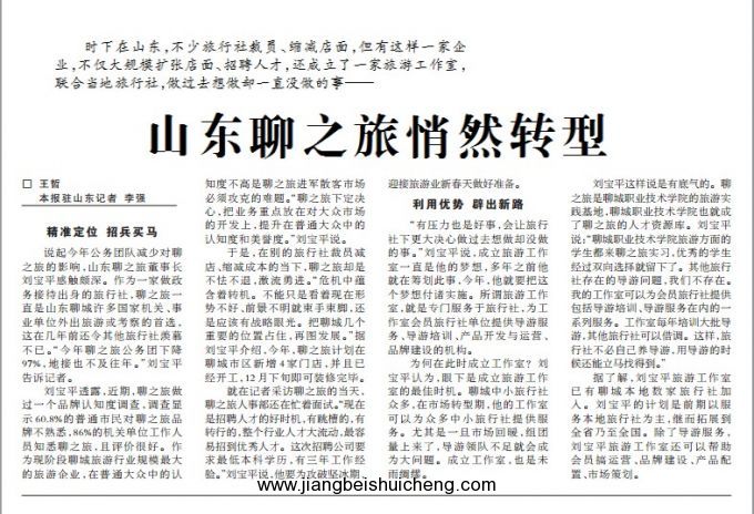 為何在此時(shí)成立工作室?劉寶平認(rèn)為,眼下是成立旅游工作室的最佳時(shí)機(jī)。聊城中小旅行社眾多,在市場(chǎng)轉(zhuǎn)型期,他的工作室可以為眾多中小旅行社提供服務(wù)。尤其是一旦市場(chǎng)回暖,組團(tuán)量上來了,導(dǎo)游領(lǐng)隊(duì)不足就會(huì)成為大問題。成立工作室,也是未雨綢繆。