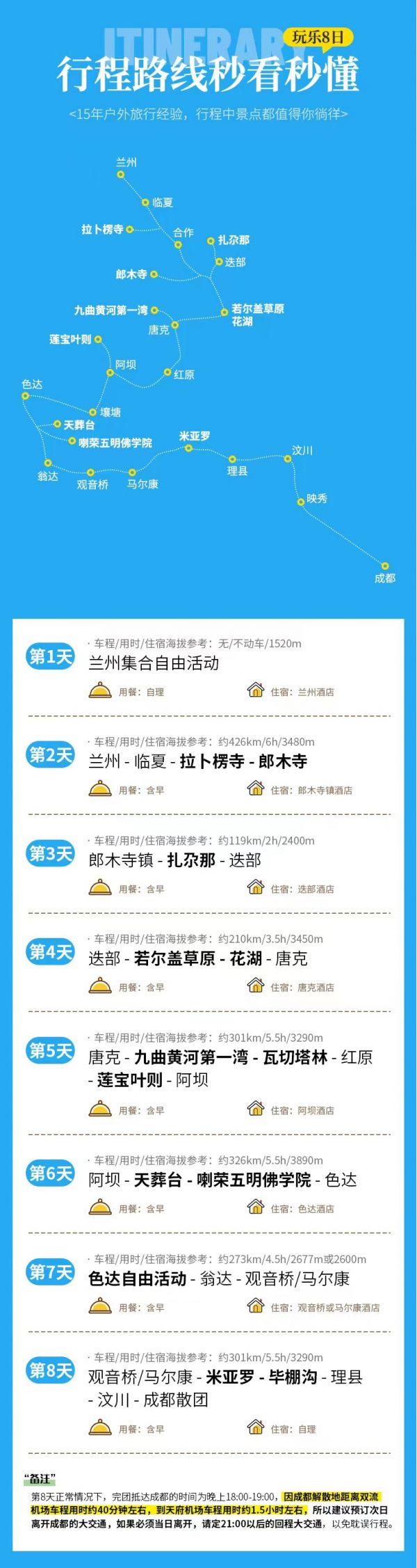 請對應(yīng)使用我方色達甘南2-6人小團8日行程,因使用其它行程造成的投訴,責任自負;請仔細閱讀以上行程文檔,同意并保證遵守我方安排,以免為您帶來不必要的麻煩;如產(chǎn)生合同糾紛或人身意外事故,按《中華人民共和國合同法》、《道路交通法》、《保險賠償條例》裁定;本行程作為旅游合同附頁與旅游合同同等法律效力。